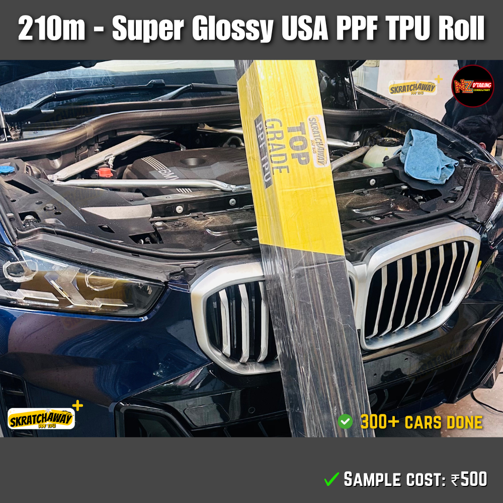 Skratchaway+™ | The USA PPF TPU is actually a top class high end PPF TPU that gets produced in a USA factory for many popular European brands (& a very popular German Brand sold in India) and some USA brands & (a very popular USA brand sold in India) and some of them even get imported in India for high end detailers. The same PPF gets sold as a ceramic coated platinum PPF TPU and features automatic self healing for superb gloss and easy daily maintenance. We have used this on 300+ cars across India in the last 36 months. It features super gloss like ceramic coating and instant automatic self healing for swirl marks and dust scratches. Comes with a long life expectancy. Optional 10 years and 12 years warranty packages available with our 220m & 240m heavy duty PPF.
